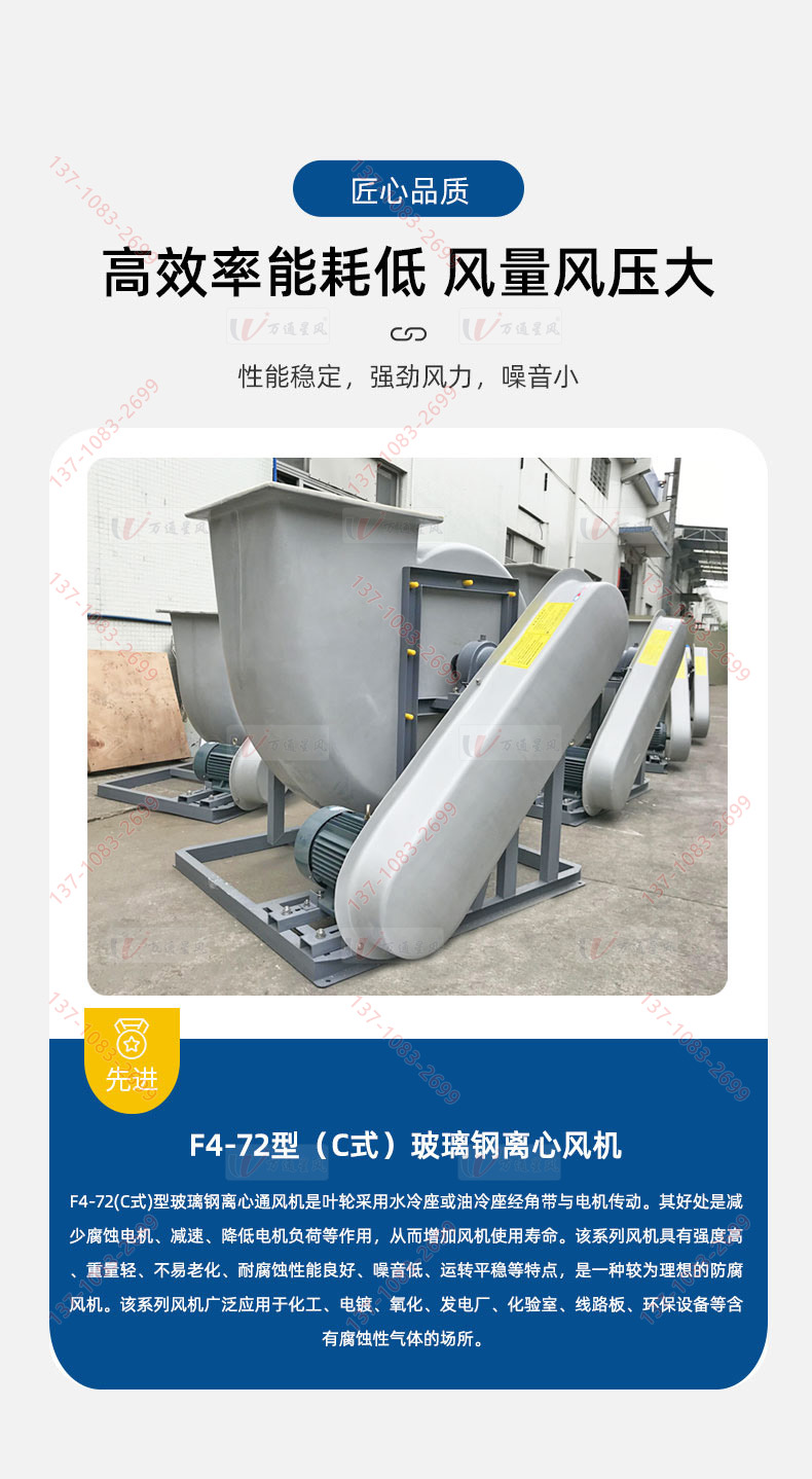 F4-72型C式采用进口树脂(玻璃钢FRP)复合材质制作而成,C式风机叶轮采用水冷座或油冷座经角带与电机传动,从而增加风机使用寿命。